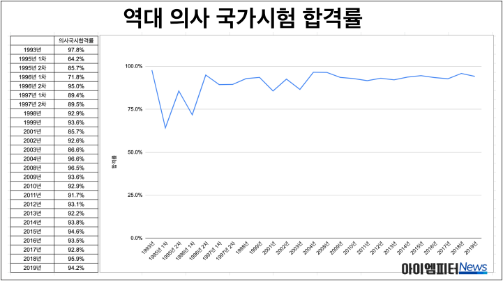 평균 90%가 넘는 의사 국시 합격률이 1995년과 1996년에는 각각 64.2%, 71.8%에 불과합니다. 2년 연속 의사 국시에서 대량의 탈락자가 발생한 것입니다.