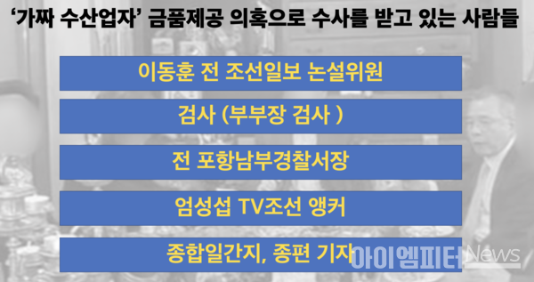 가짜 수산업자로부터 금품을 제공받은 의혹을 수사를 받거나 입건된 사람들을 보면 '이동훈 전 조선일보 논설위원', ' 부부장 검사', '전 포항남부경찰서장',' 엄성섭 TV조선 앵커', ' 종합일간지 기자', '종편 기자' 등입니다.