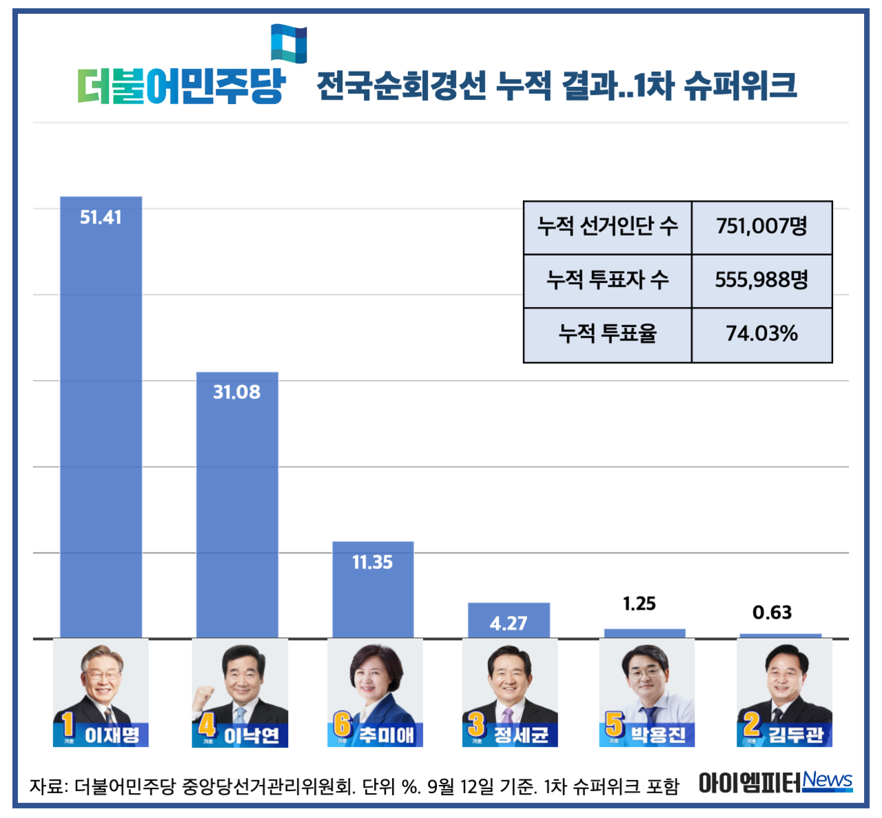 12일 기준 민주당 누적 선거인단 수는 751,007명이며 누적 투표자 수는 555,988명이며 투표율은 74.03%로 나타났습니다. 특히 1차 선거인단은 64만 명 중 47만이 참여해 77.37%의 높은 투표율을 기록했습니다.