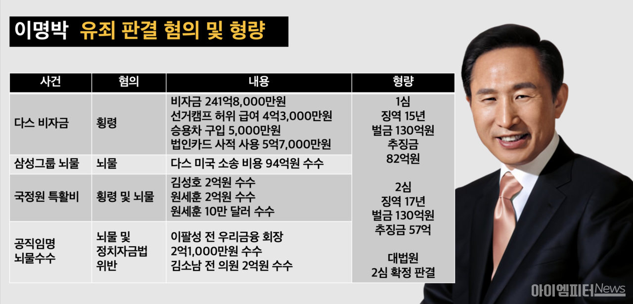 'MB 사면'을 두고 다양한 의견이 나오는 가운데, 도대체 이명박 전 대통령이 무슨 혐의로 유죄를 받았는지 정리했습니다.