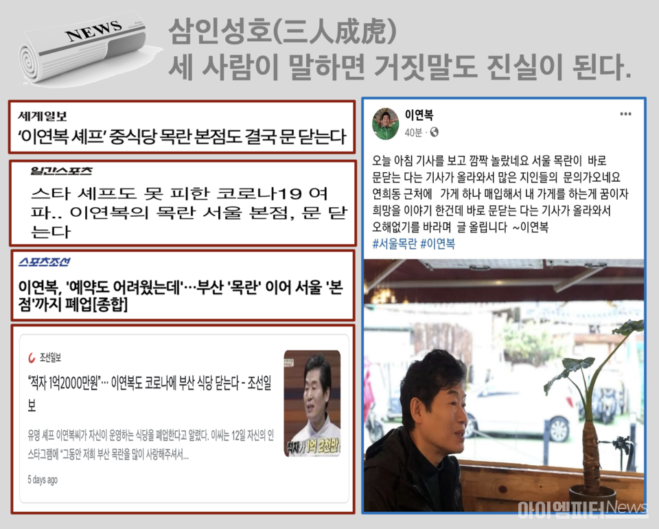 3개의 언론사가 포털에 이연복 셰프의 식당이 폐업했다고 하니 진짜 망한 것처럼 보입니다. 일반인도 아닌 언론사가, 그것도 하나도 아닌 여러 개의 언론사가 일제히 보도하면 안 믿을 사람이 누가 있겠습니까?