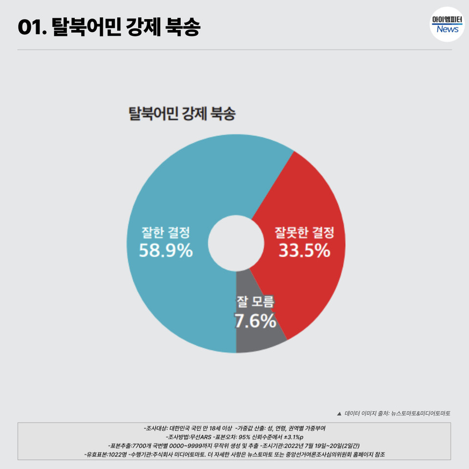 22일 <뉴스토마토>가 여론조사 전문기관 <미디어토마토>에 의뢰해 지난 19~20일 만 18세 이상 전국 성인남녀 1022명을 대상으로 실시한 '선거 및 사회현안 45차 정기 여론조사' 결과에 따르면, 전체 응답자의 58.9%가 지난 2019년 탈북한 북한 어민 2명을 강제 북송한 문재인정부의 조치에 대해 "잘한 결정"이라고 응답했다. 모든 연령과 지역에서 긍정평가 응답이 높은 가운데 60대 이상에서도 잘한 결정 48.4%, 잘못한 결정 43.5%로 나타났다.