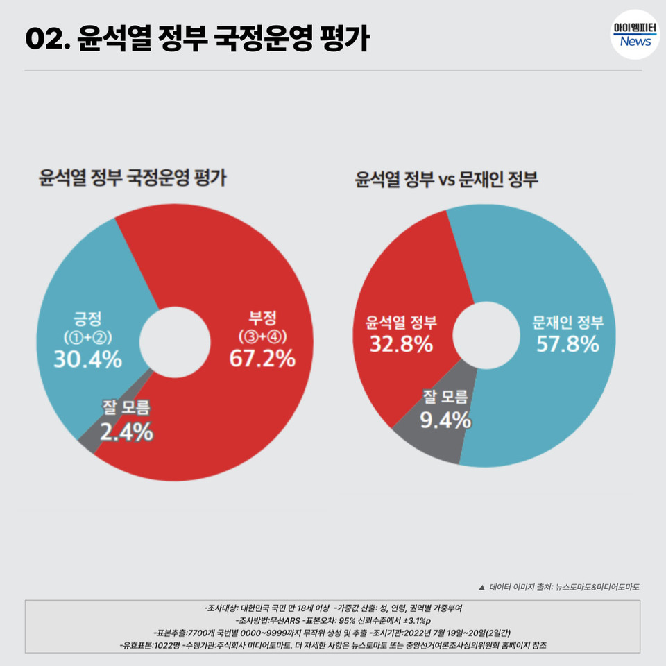 윤석열 정부를 전임 문재인 정부와 비교할 때 어느 정부에 더 높은 점수를 주시겠습니까?라는 질문에는 57.8%가 문재인 정부의 손을 들어줬다. 윤석열 정부에 점수를 더 주겠다는 응답자는 32.8%에 그쳤다. 특이한 점은 중도 성향의 응답자 59.4%가 문재인 정부가 더 잘했다고 답했다는 것이다.