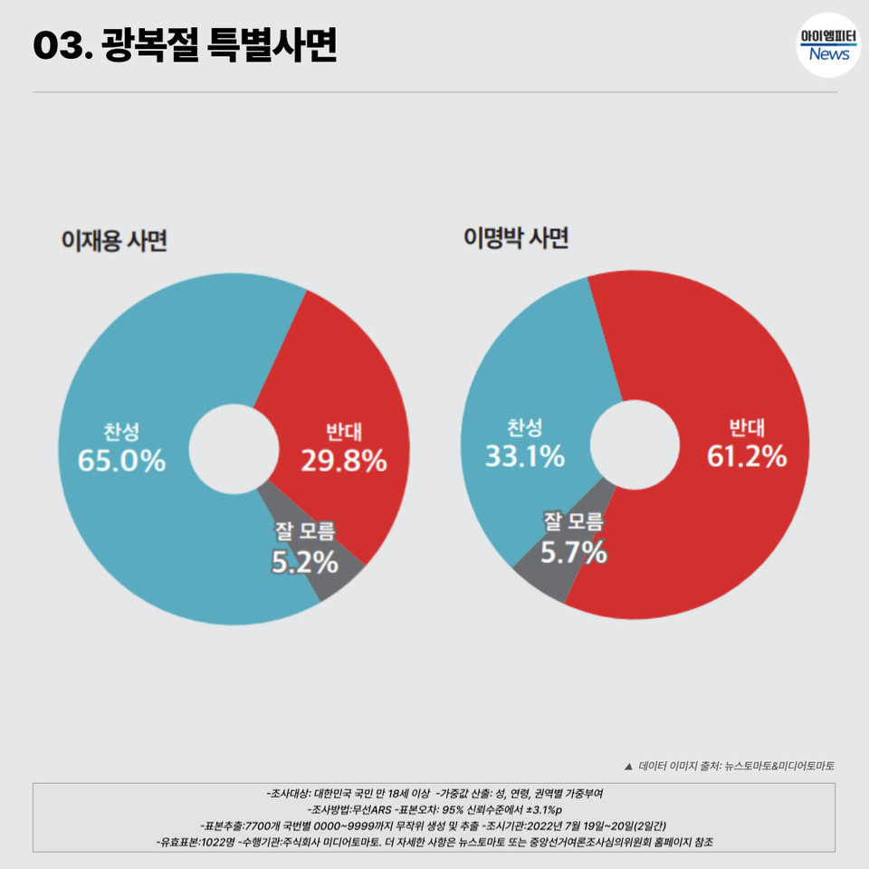 이명박 사면에는 61.2%가 반대하지만 이재용 삼성전자 부회장은 65%가 찬성하는 것으로 조사됐다. 광복절 특별사면 대상으로 이명박을 포함하는 것은 33.1%만 찬성했다. 이재용 삼성전자 부회장 사면은 전연령대 골고루 50% 이상 넘게 찬성한다고 답했다.