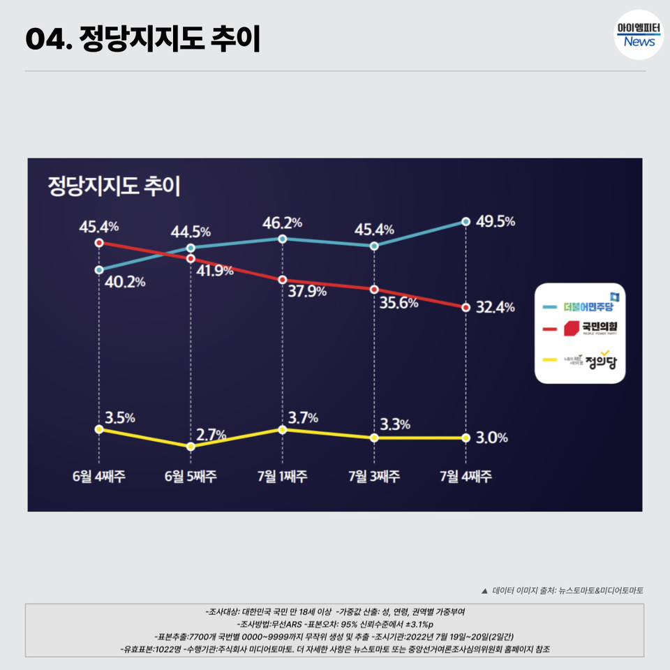 7월 네째 주 정당 지지도를 보면 더불어민주당 49.5%로 셋째 주에 비해 4.1%p 올랐다. 국민의힘은 32.4%로 3.2%p 하락했다.