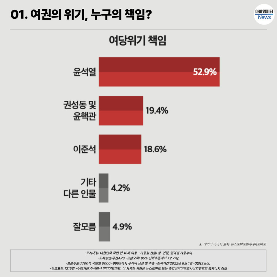 8월 5일 <뉴스토마토>가 여론조사 전문기관 <미디어토마토>에 의뢰해 지난 1일부터 3일까지 사흘간 만 18세 이상 전국 성인남녀 1315명을 대상으로 실시한 '선거 및 사회현안 47차 정기 여론조사' 결과에 따르면, 여권의 위기에 누구의 책임이 가장 크다는 질문에 전체 응답자의 52.9%가 '윤석열 대통령'을 지목했다.