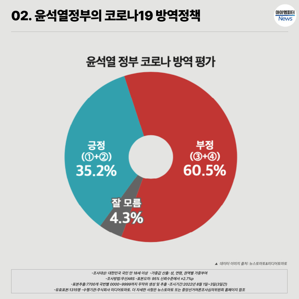 윤석열 정부의 코로나19 방역정책에 대해 어떻게 평가하느냐는 물음에는 부정 평가가 60.5%로 긍정 (35.2%)보다 월등히 높았다.