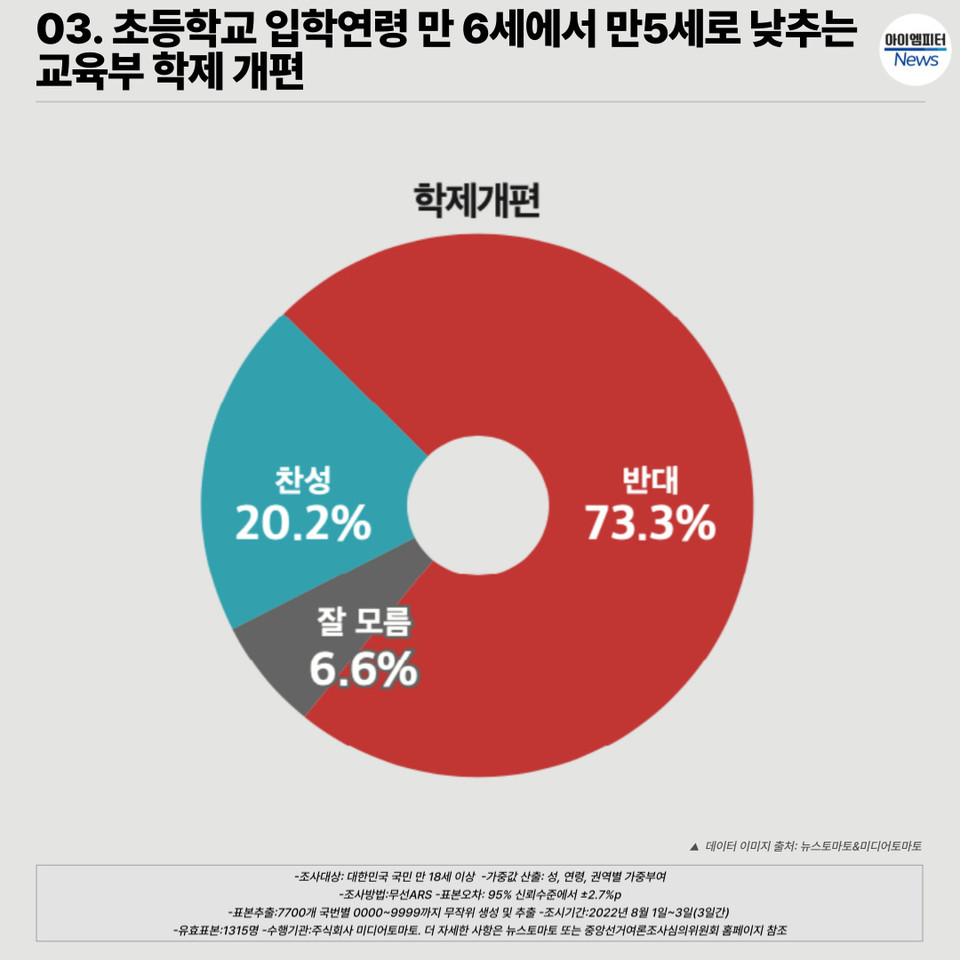 초등학교 입학연령을 만6세에서 만5세로 낮추는 교육부의 학제 개편안에 대해서는 반대가 73.3%로 찬성(20.2%)의 세 배가 넘었다.