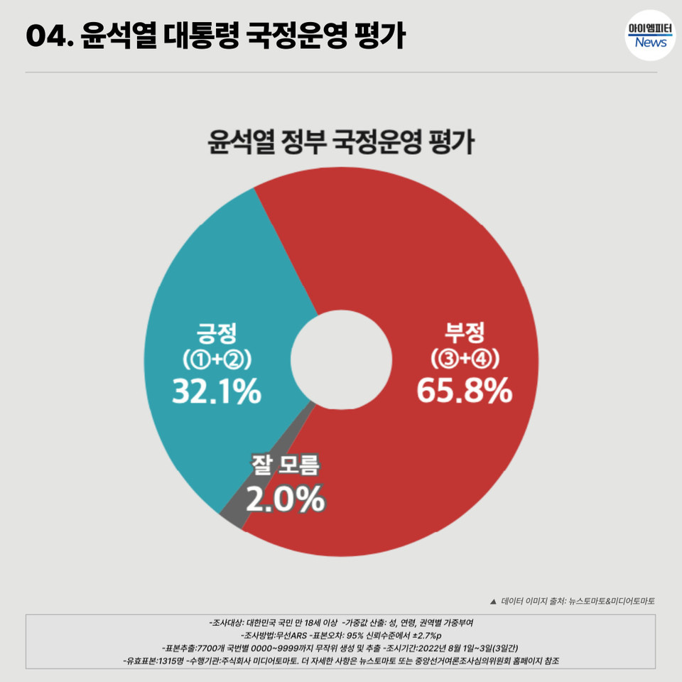 윤석열 대통령의 국정운영에 대해 전체 응답자의 65.8%가 부정평가를 했고 긍정평가는 32.1%에 그쳤다. 특히 국민 절반이 넘는 55.9%가 윤 대통령이 "매우 잘못하고 있다"며 극단적 부정평가를 내렸다.