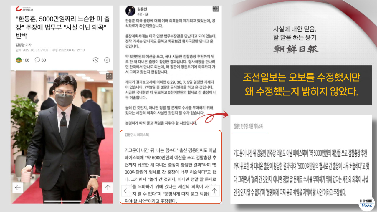 8월 7일 <조선일보>는 '“한동훈, 5000만원짜리 느슨한 美출장” 주장에... 법무부 “왜곡”'이라는 제목의 기사를 포털과 자사 홈페이지에 송고했다. 기사는 한동훈 법무부 장관의 미국 출장 의혹에 대한 법무부 입장을 담은 내용이었다.