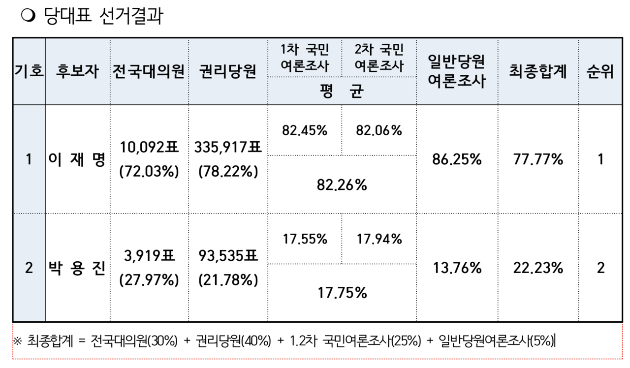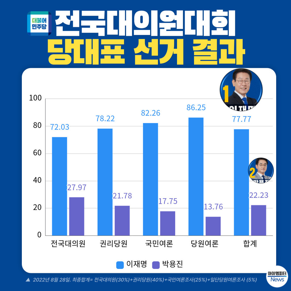 이재명 신임 대표는 28일 서울올림픽 체조경기장에서 개최된 더불어민주당 제5회 정기전국대의원대회 당 대표 선거 결과 77.77%의 득표율로 박용진 후보(22.23%)를 압도적인 표차로 제치고 당대표로 선출됐습니다.