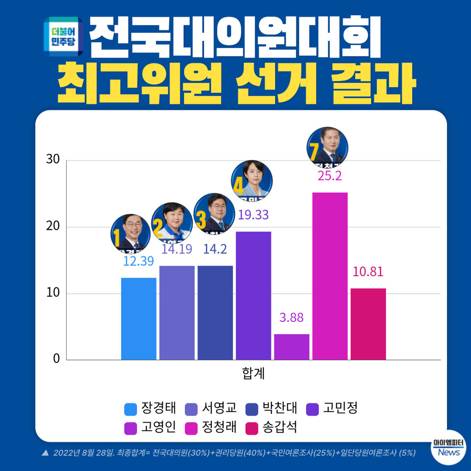 최고위원으로는 정청래(26.20%.3선), 고민정(19.33%.초선), 박찬대(14.20%.재선), 서영교(14.19%.3선), 장경태(12.39%.초선) 의원이 선출됐습니다.