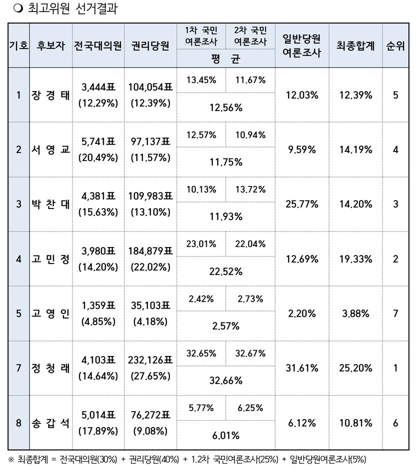 최고위원 후보별 득표수와 득표율은 아래와 같습니다.