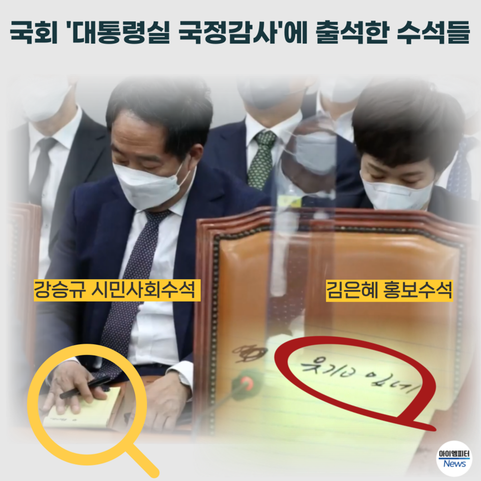 <이데일리>가 공개한 사진에는 '웃기고 있네'라는 문구가 있었습니다. 이 문구는 국감장에 증인으로 출석한 강승규 시민사회수석의 노트에 적혀 있었습니다. 또한, 옆에 앉았던 김은혜 홍보수석이 문구를 펜으로 지우는 모습도 포착됐습니다.