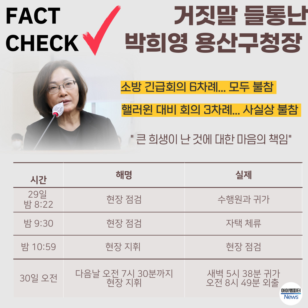 박희영 용산구청장은 이태원 참사 당일 두 차례나 현장을 순찰하고 사고 현장을 지휘 통제했다고 주장했습니다. 그러나 박 구청장의 주장이 대부분 거짓으로 드러났습니다.