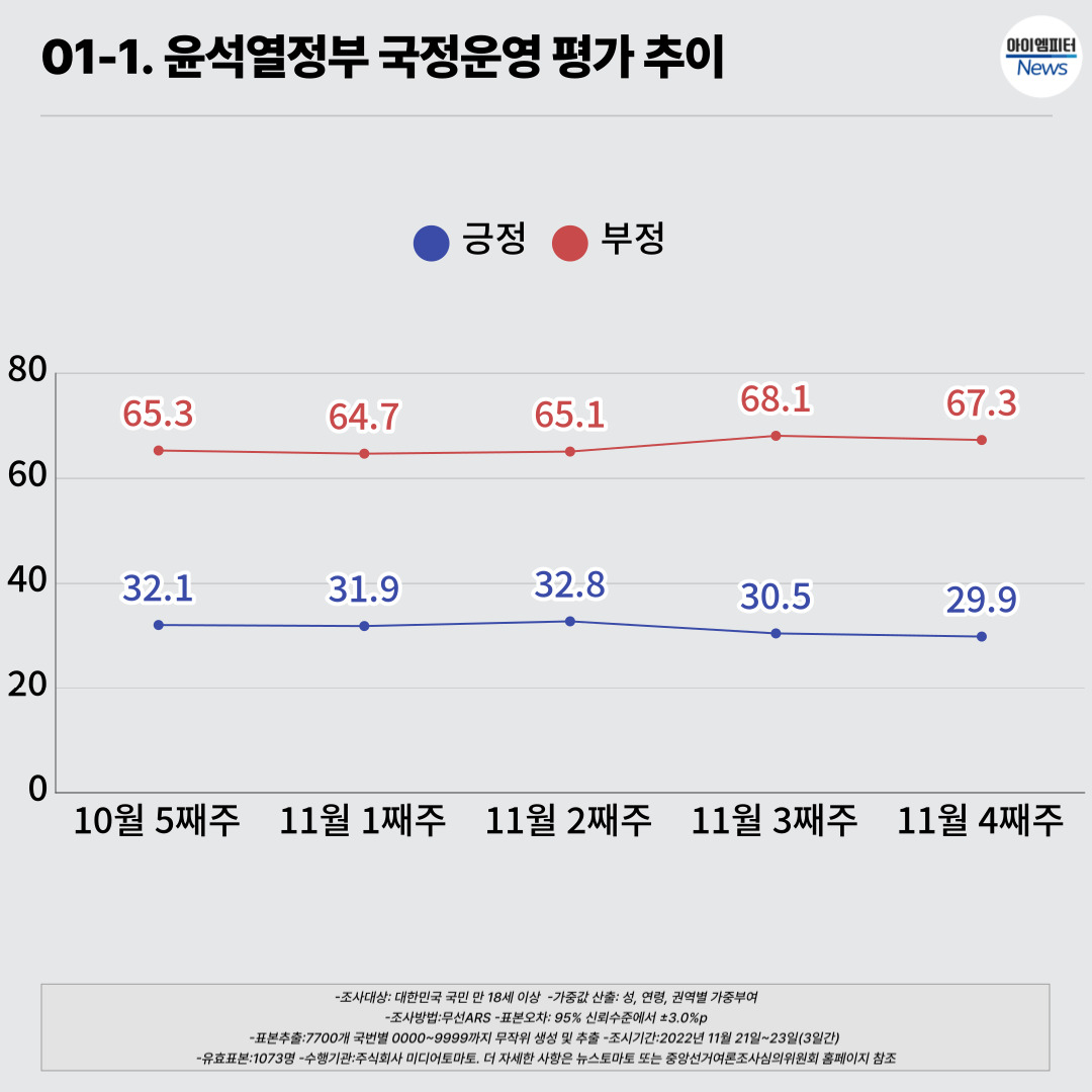 윤 대통령 국정운영 평가는 10월 다섯째 주 32.1%에서 11월 둘째 주 32.8%로 소폭 상승했지만, 11월 넷째 주에는 29,9%로 하락했습니다.
