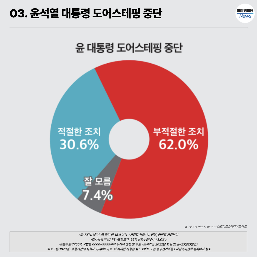 국민 62.0%는 윤석열 대통령의 '도어스테핑' 중단에 대해 "국민과의 소통을 단절하는 부적절한 조치"라고 평가했습니다.