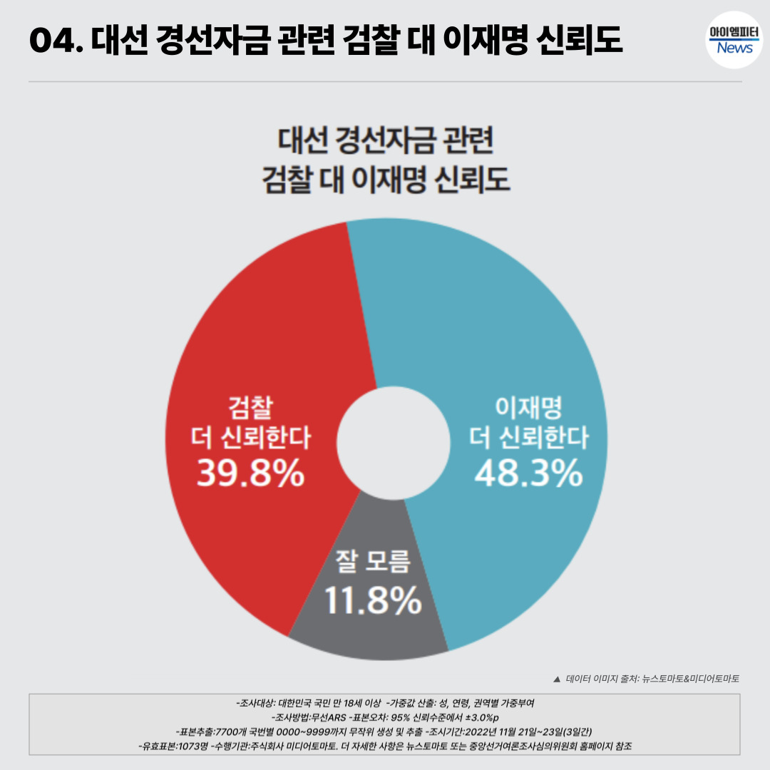 국민 48.3는 검찰의 주장보다 이재명 대표를 더 신뢰한다고 응답했습니다. 다만, 검찰을 신뢰한다는 대답도 39,8%로 조사됐습니다.
