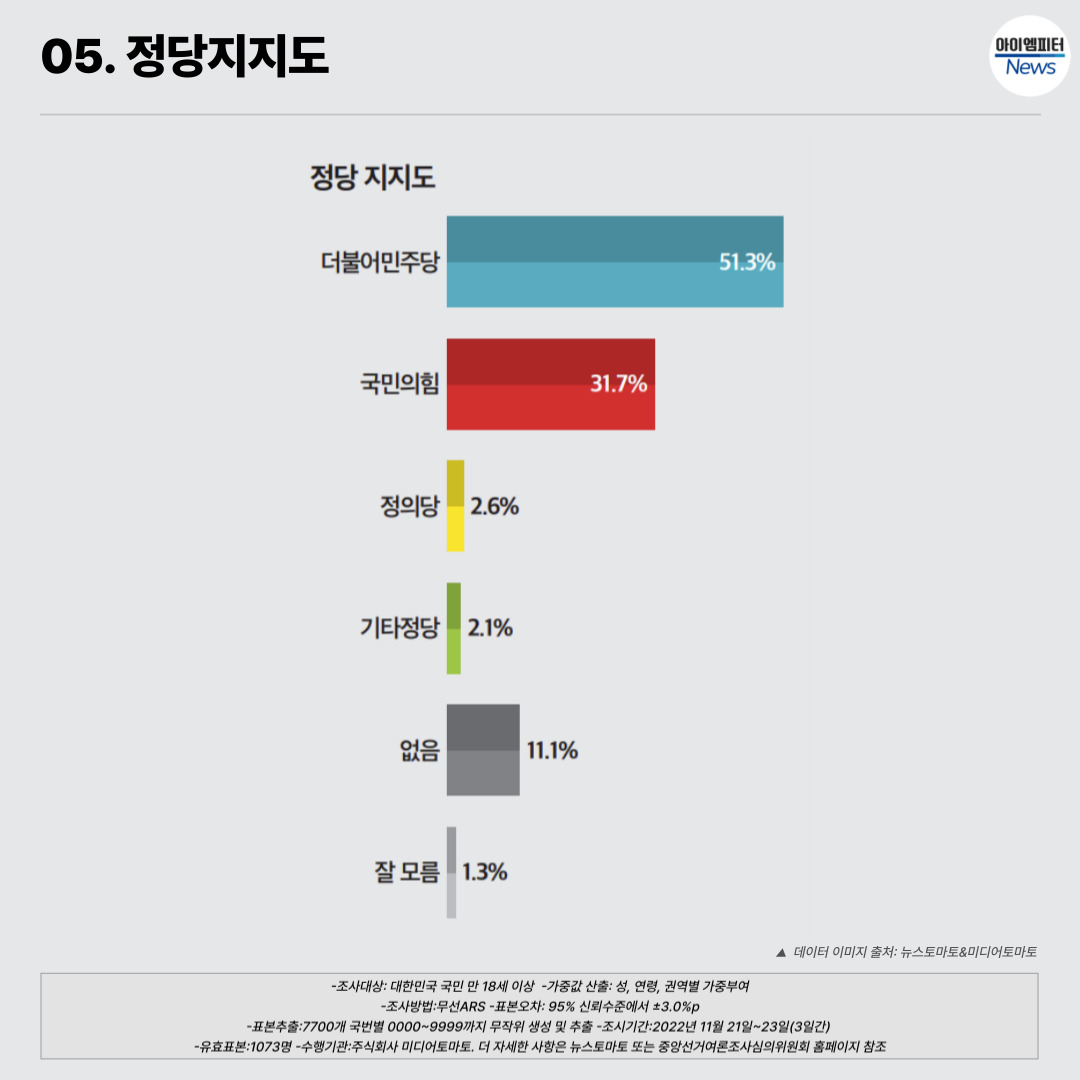 민주당의 지지율이 51.3%로 31.7%의 국민의힘을 크게 앞섰습니다. 두 당의 격차는 지난주 13.0% 포인트에서 이번주 19.6% 포인트로 격차가 더 벌어졌습니다.