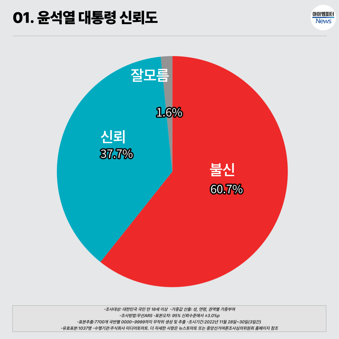12월 2일 <뉴스토마토>가 여론조사 전문기관 <미디어토마토>에 의뢰해 지난달 28일부터 30일까지 사흘간 만 18세 이상 전국 성인남녀 1037명을 대상으로 실시한 '선거 및 사회현안 63차 정기 여론조사' 결과에 따르면, 윤 대통령의 신뢰 여부에 대해 전체 응답자의 37.7%는 신뢰('매우 신뢰한다' 22.4%, '대체로 신뢰한다' 15.3%)를, 60.7%는 불신('매우 신뢰하지 않는다' 51.3%, '대체로 신뢰하지 않는다' 9.4%)한다고 응답했습니다.