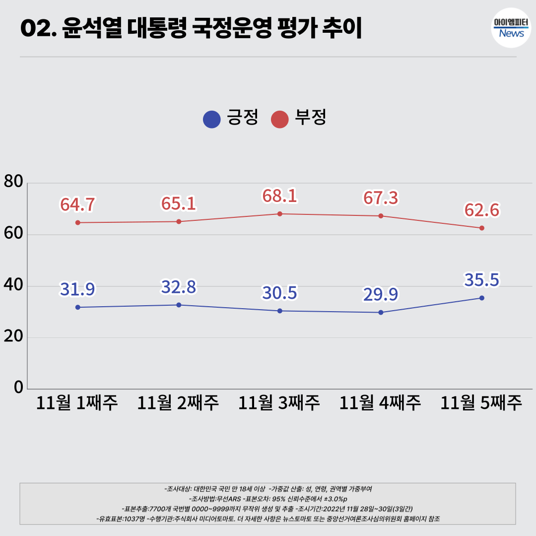 윤석열 대통령의 국정운영 지지율은 지난주 29.9%에서 이 번주 35.5%로 5.6%포인트 상승했습니다.