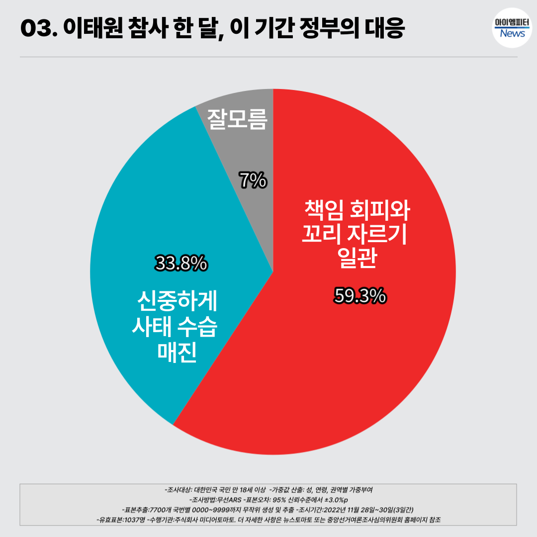 응답자의 59.5%는 '정부가 책임 회피와 꼬리 자르기로 일관한다'고 답했습니다. '신중하게 사태를 수습한다'는 대답은 33.8%에 그쳤습니다.