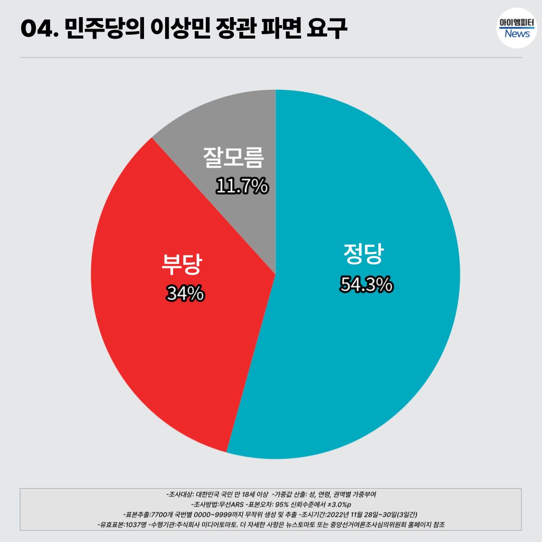 국민 54.3%는 민주당이 요구하는 이상민 행정안전부 장관 파면 요구가 '정당'하다고 응답했습니다. '부당'하다는 34.0%에 불과했습니다.
