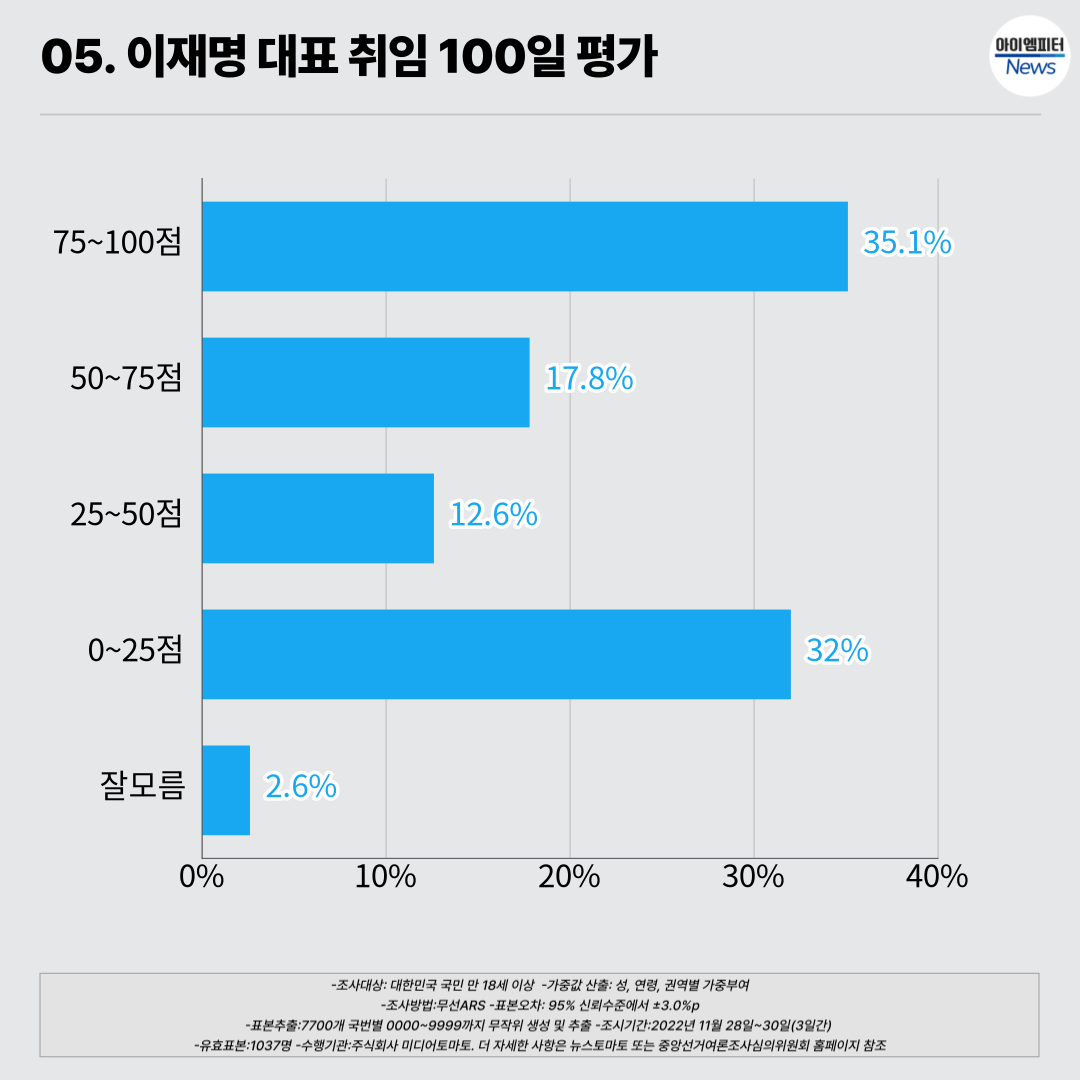 이 대표 취임 100일 평가를 묻는 질문에 35.1%는 '75점 이상'의 높은 점수를 줬지만, 32.0%는 '25점 이하'의 낙제점을 줬습니다.