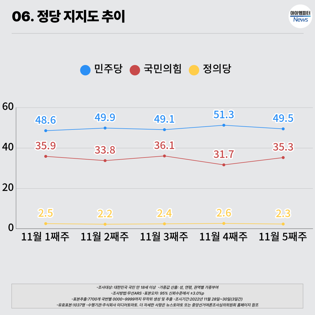 정당지지도에서 민주당(49.5%)이 국민의힘(35.3%)을 크게 앞섰습니다. 그러나 두 정당의 격차는 지난주 19.6% 포인트에서 이번 주 14.2%포인트로 줄어들었습니다.