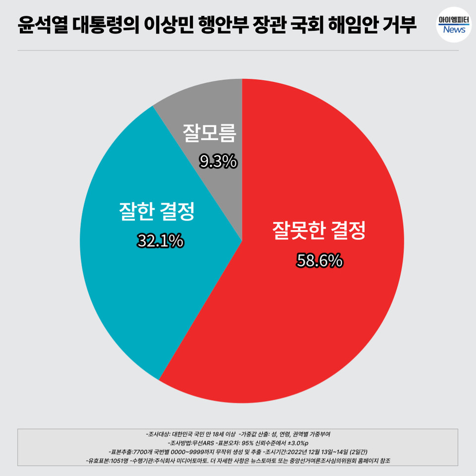 윤석열 대통령이 국회가 제출한 이상민 장관 해임 건의안을 사실상 거부한 것에 대해 60%에 가까운 국민들이 '잘못한 결정'이라고 지적했습니다.