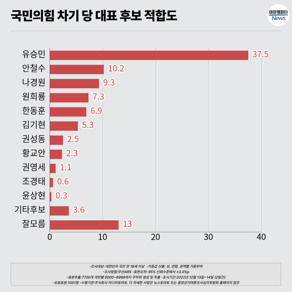 2위는 안철수 의원(10.2%), 3위는 나경원 전 의원(9.3%)이 차지했지만, 유 전 의원과의 격차는 27%가 넘게 차이 났습니다.