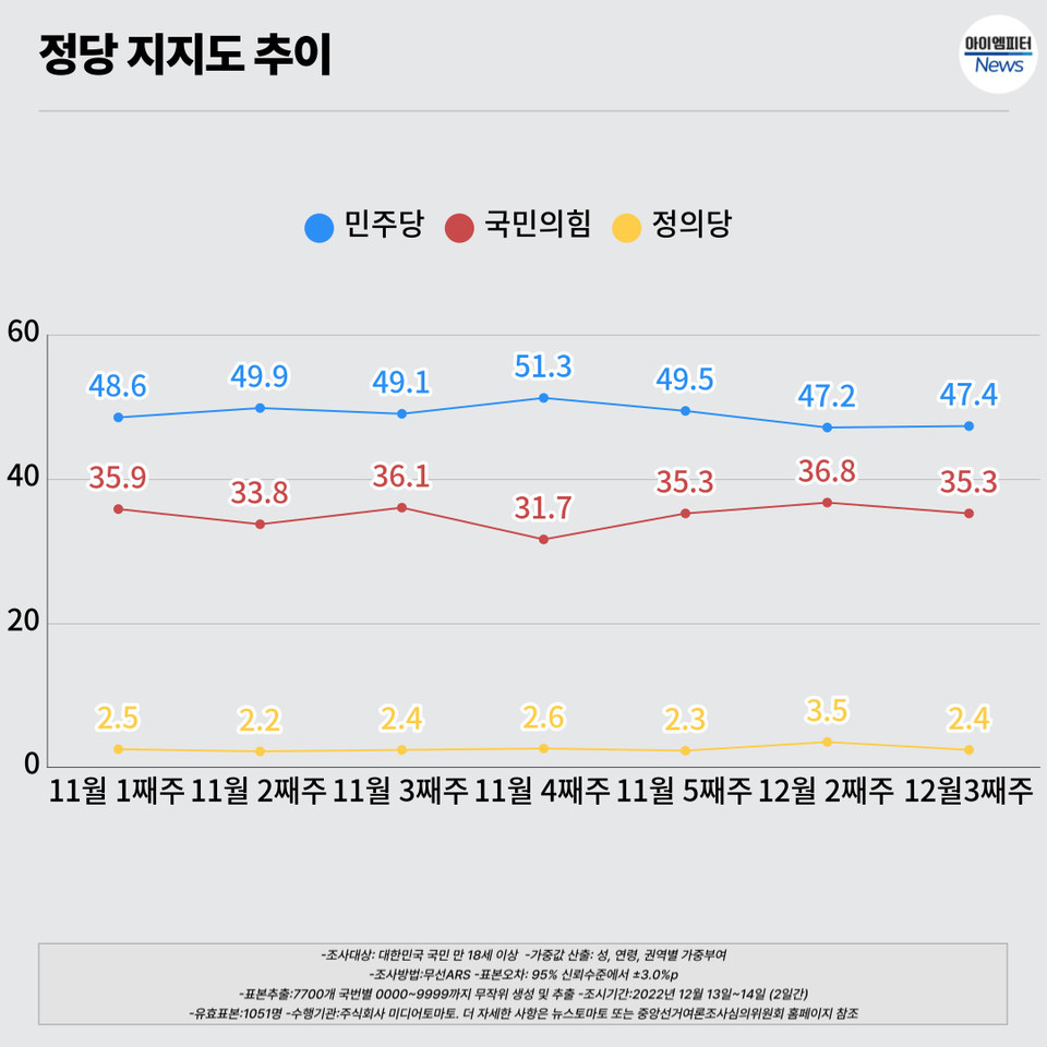 정당지지도에서는 민주당이 47.4%로 여전히 국민의힘(35.3%)을 앞섰습니다. 지난주와 비교하면 민주당은 0.2% 포인트 상승했고, 국민의힘은 1.5% 포인트 하락했습니다.