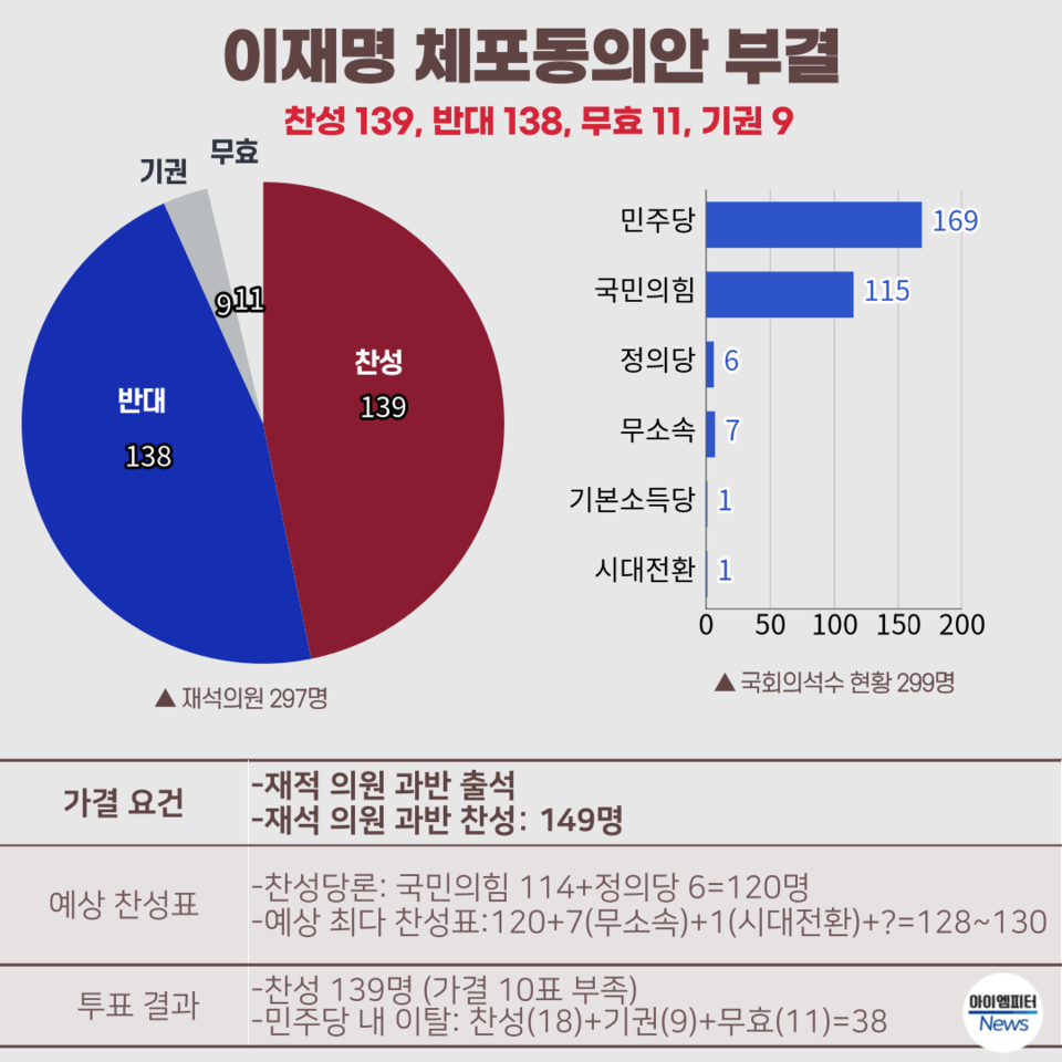 이재명 대표의 체포동의안은 투표 결과 찬성 139명, 반대 138명, 무효 11명, 기권 9명으로 나왔다.