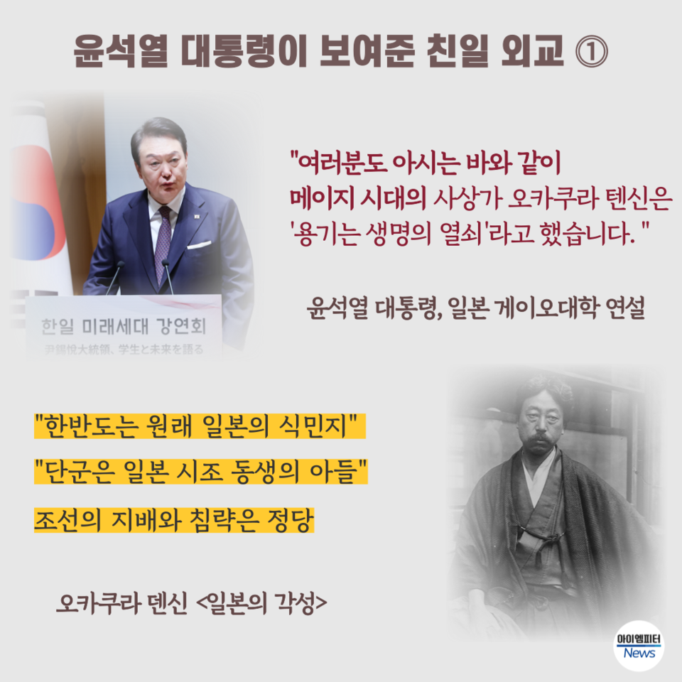 윤석열 대통령은 17일 일본 게이오대에서 "우리의 미래를 위한 용기"라는 제목으로 연설했다. 윤 대통령은 "여러분도 아시는 바와 같이 메이지 시대의 사상가 오카쿠라 텐신은 '용기는 생명의 열쇠'라고 했습니다."라며 오카쿠라 텐신의 말을 인용했다.