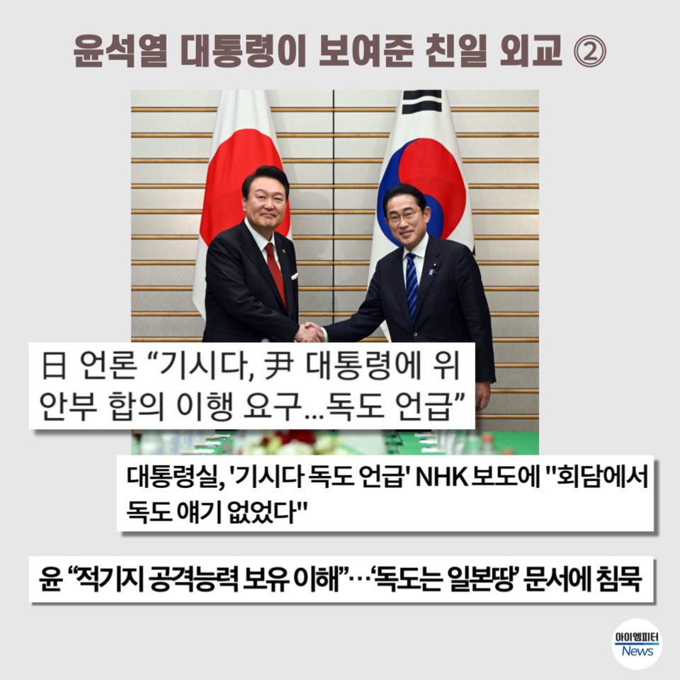 야당은 윤 대통령의 행보를 '친일'을 넘어 '숭일'이라고 주장했다. 윤 대통령이 일본 방문 당시 보여준 친일외교를 모아봤다.