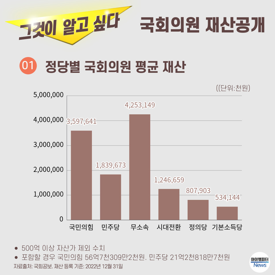 안철수, 전봉민, 박덕흠, 박정 의원 등 500억 이상 자산가를 포함하면 정당별 평균 재산은 국민의힘 56억7천309만2천원, 민주당 21억2천818만7천원이다.