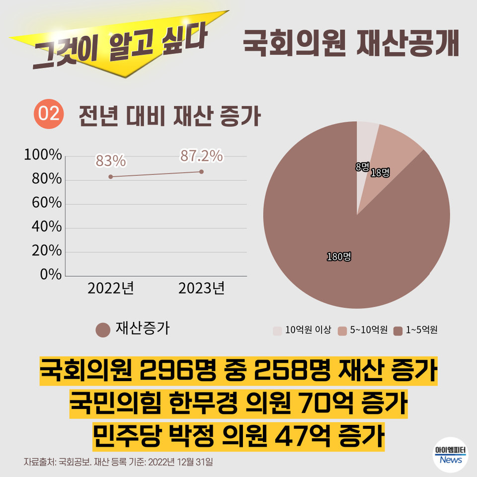 국회의원 296명 중 지난해보다 재산이 늘어난 국회의원은 총 258명이다. 재산이 늘어난 의원 비율은 2022년 83%에서 2023년 87.2%로 평균 1억 4천만원이 증가했다.