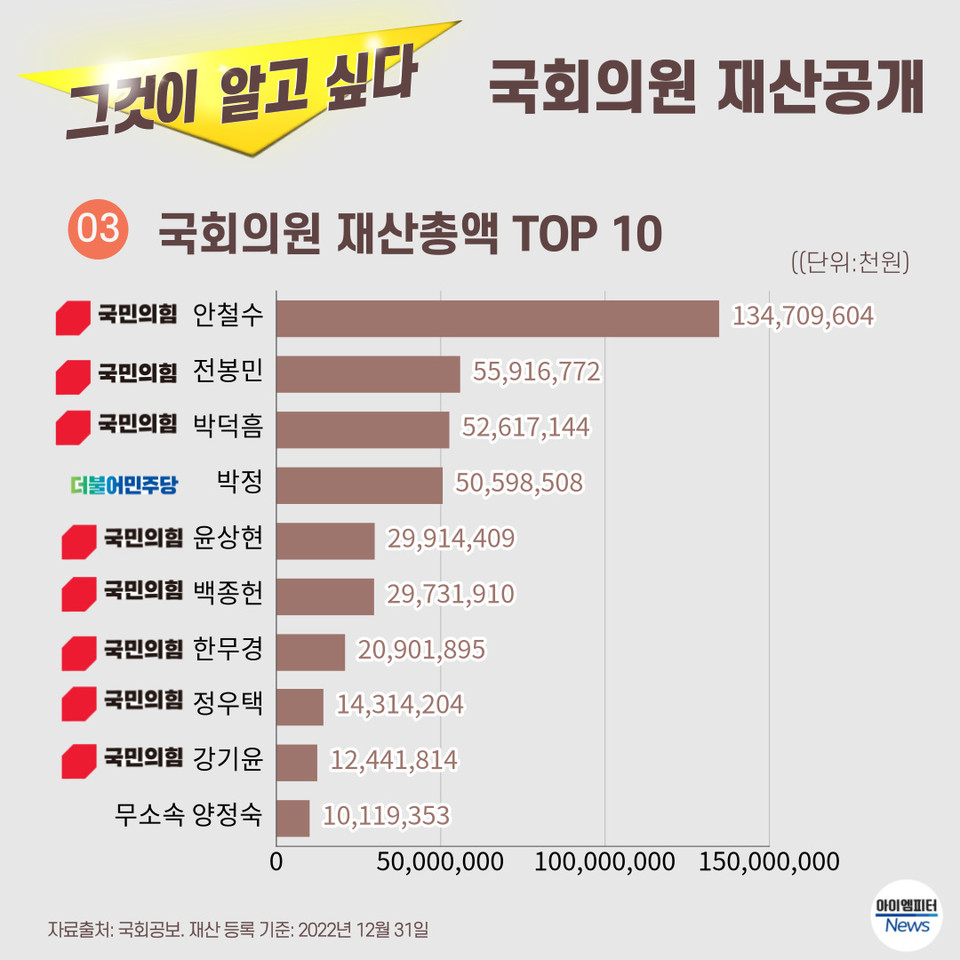국회의원 재산 총액 상위 10명을 정당별로 보면 국민의힘 8명, 민주당 1명, 무소속 1명으로 조사됐다.