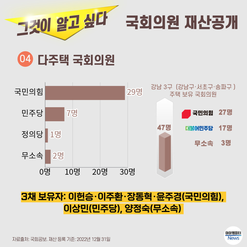 3채를 보유한 의원은 국민의힘 이헌승·이주환·장동혁·윤주경 의원, 민주당 이상민 의원, 무소속 양정숙 의원이다. 양 의원은 부천시 주상복합건물과 본인과 배우자 명의로 서울 강남구 대치동과 서초구 서초동 아파트 각 1채씩을 보유했다.