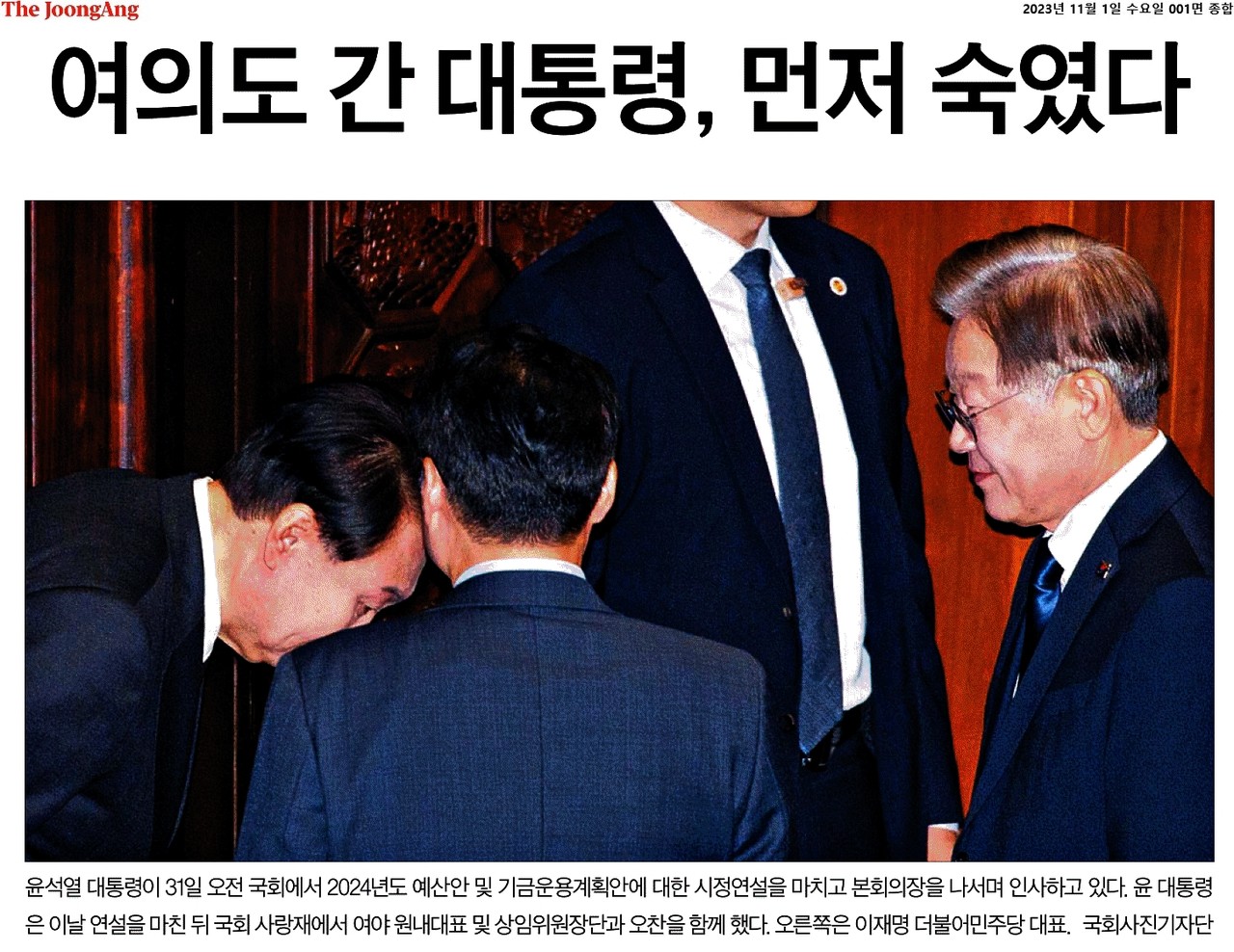 윤석열 대통령의 국회 시정연설 다음날인 11월 1일, <중앙일보> 1면 기사 제목이다. 제목 아래에는 윤 대통령이 이재명 대표에게 고개를 숙여 인사하는 것처럼 보이는 사진이 배치됐다. 제목과 사진을 보면 누구라도 윤 대통령이 이 대표에게 머리를 숙인 것처럼 보인다.