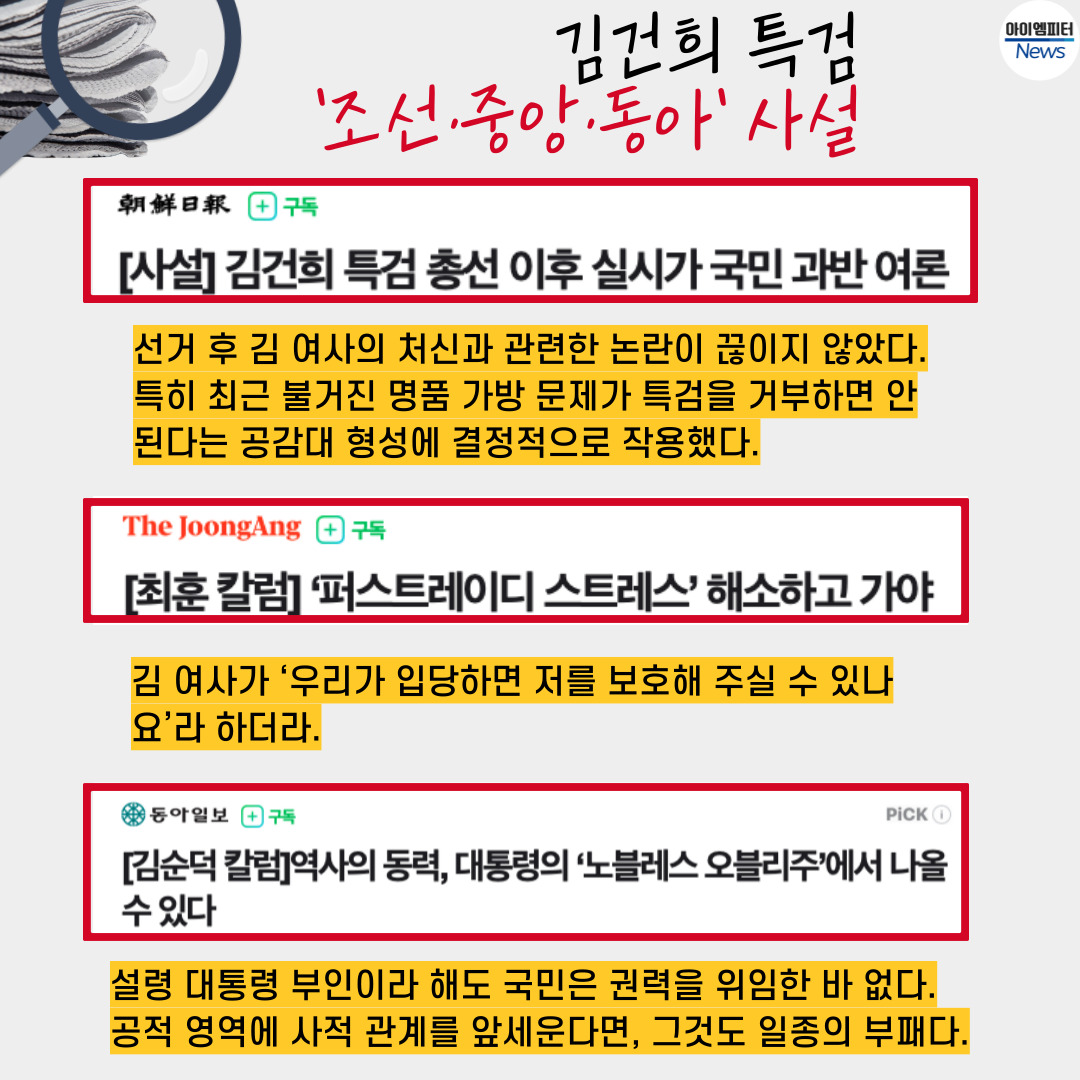 <조선일보>는 윤 대통령이 특검을 받을 수밖에 없는 이유로 "대통령 선거 때는 ‘내조만 하겠다’고 했는데 선거 후 김 여사의 처신과 관련한 논란이 끊이지 않았다."라며 "특히 최근 불거진 명품 가방 문제가 특검을 거부하면 안 된다는 공감대 형성에 결정적으로 작용했다."라고 설명했다.