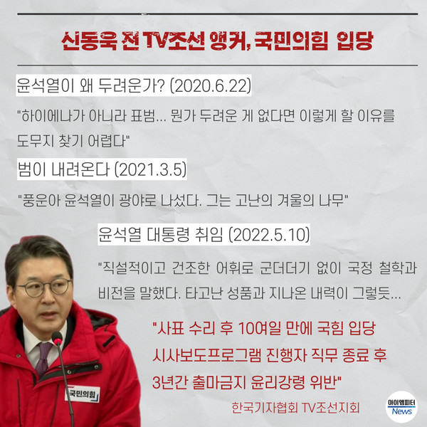 지난 29일 국민의힘 인재영입식에 등장해 빨간색 점퍼를 입은 신동욱 전 TV조선 앵커가 2021년 '앵커의 시선'에서 발언한 내용이다. 신 전 앵커는 검찰총장직을 사퇴한 윤석열 전 총장을 '범'에 비유했다. 그는 '풍운아 윤석열'이 '광야로 나섰다', '그는 고난의 겨울나무'라면서 고통받는 사육신에도 빗댔다. 뿐만 아니다. 그는 "겨울나무가 끝끝내 봄 피는 봄 나무로 서듯 말입니다"라면서 응원 메시지로 해석할 수 있는 말로 마무리했다.