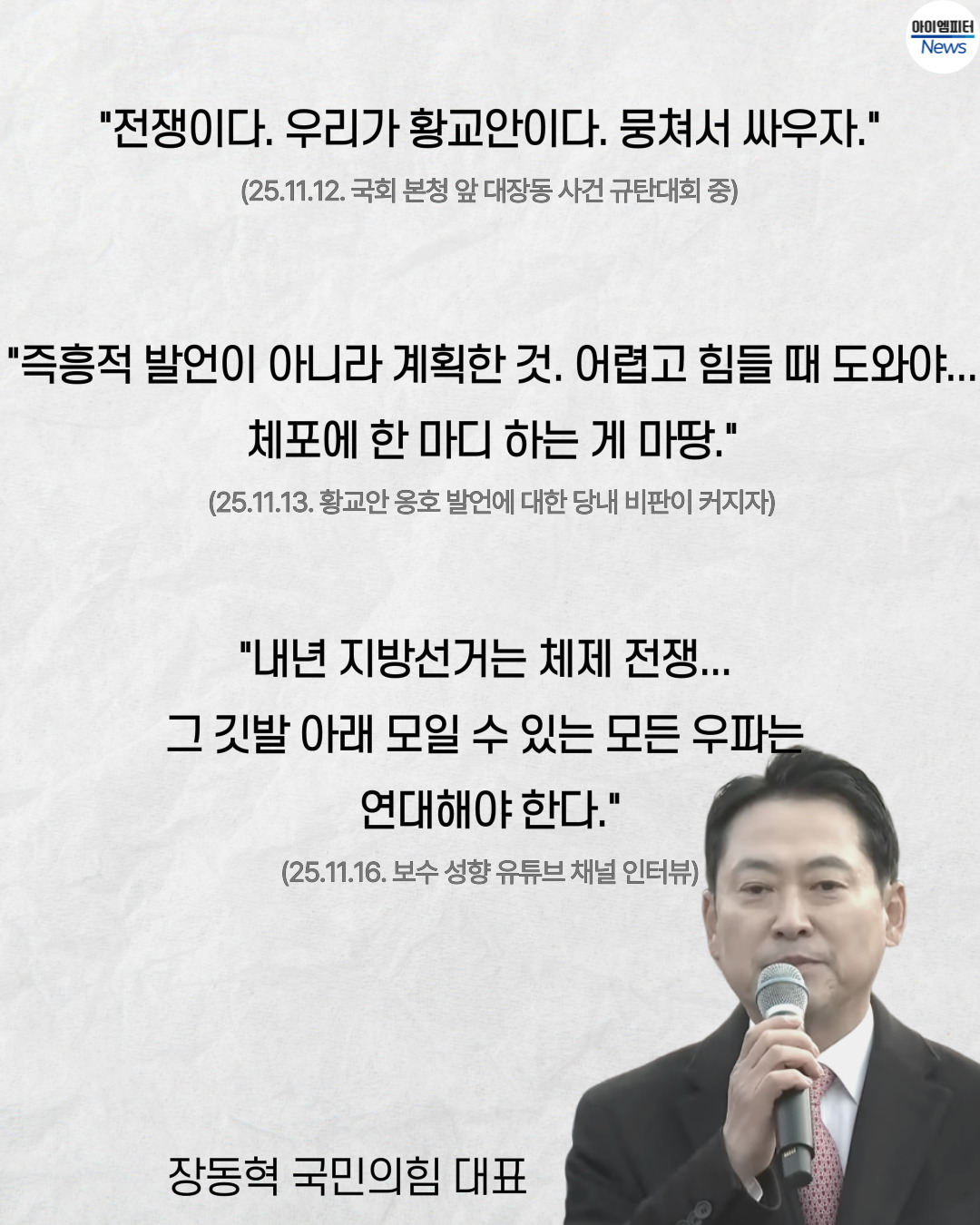 장 대표는 최근 내란 선동 혐의로 체포된 황교안 전 총리에 대해 공개적으로 "전쟁이다. 우리가 황교안이다. 뭉쳐서 싸우자"라고 선언하는가 하면, 조원진, 전광훈 등 강성 극우 진영 인사들까지 모두 규합해야 한다는 취지의 발언을 쏟아냈습니다.